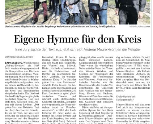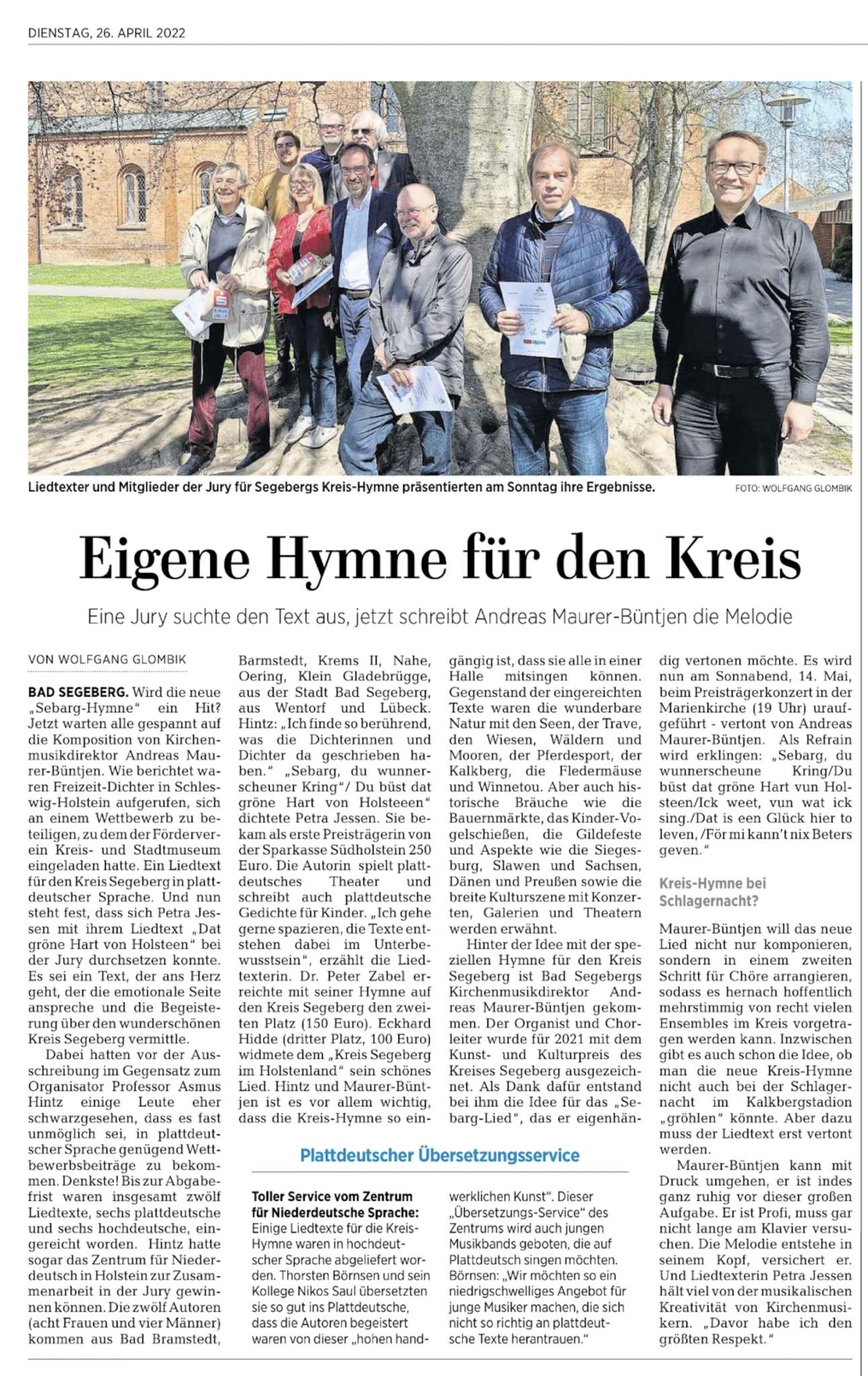 Für uns als Förderverein Kreis- und Stadtmuseum Segeberg e. V. war es eine besondere Ehre, diesen Wettbewerb zur Gewinnung eines Textes zu konzipieren und durchzuführen. Dieser Text wird unseren wunderbaren Kreis Segeberg künftig zusammen mit der von KMD Andreas Maurer-Büntjen zu komponierenden Melodie als unser „Leed för’n Kring Sebarg“ in plattdeutscher Sprache repräsentieren. Mit seiner eigenen „Hymne op Platt“ wird der Kreis Segeberg möglicherweise eine besondere Stellung im Lande Schleswig-Holstein einnehmen.