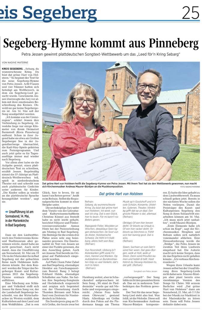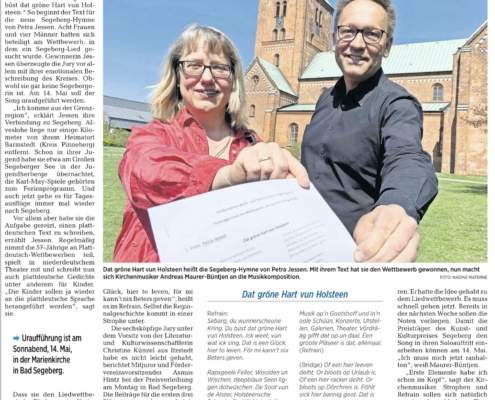 Am 25.04.2022 konnten wir die Preisträger*innen vorstellen. Beigefügt finden Sie dazu die Artikel aus den Lübecker Nachrichten und der Segeberger Zeitung von heute.